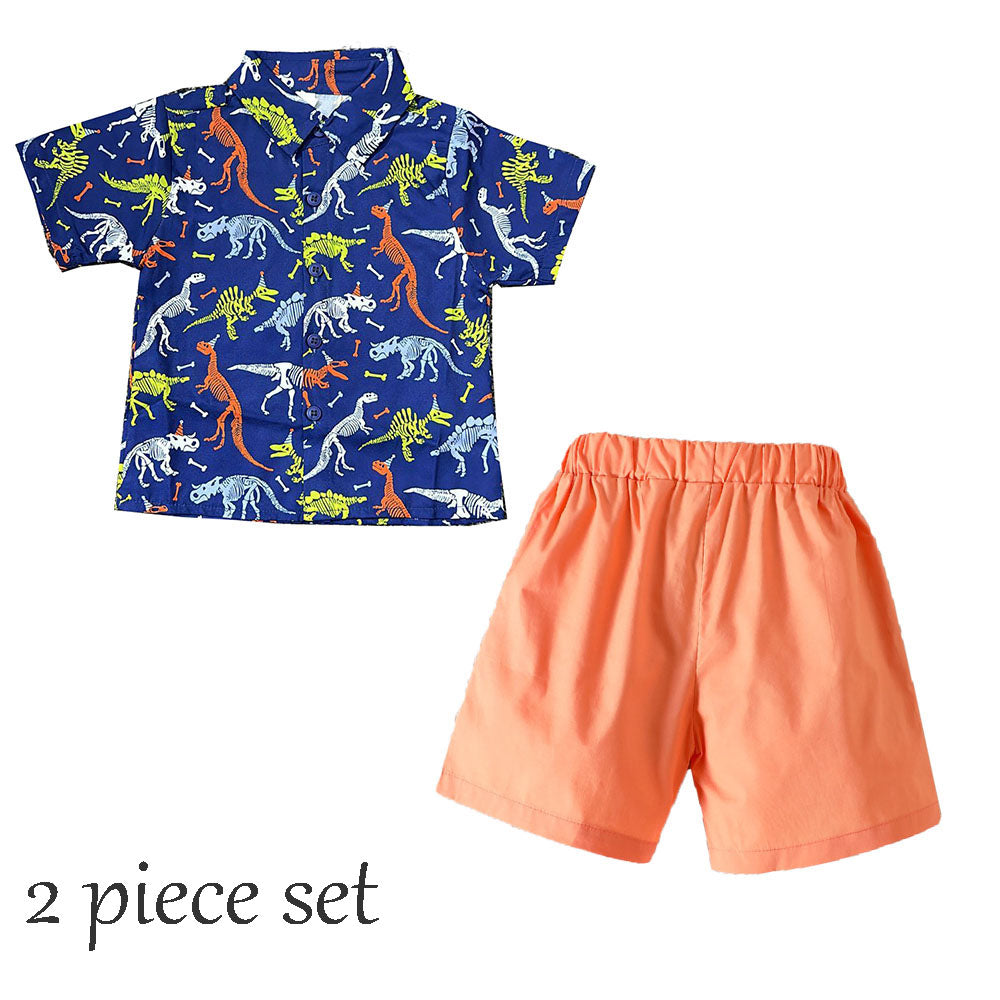 CN Multi Dino Print Linen Blue Shirt Half Slevees with Orange Cotton Shorts 12925