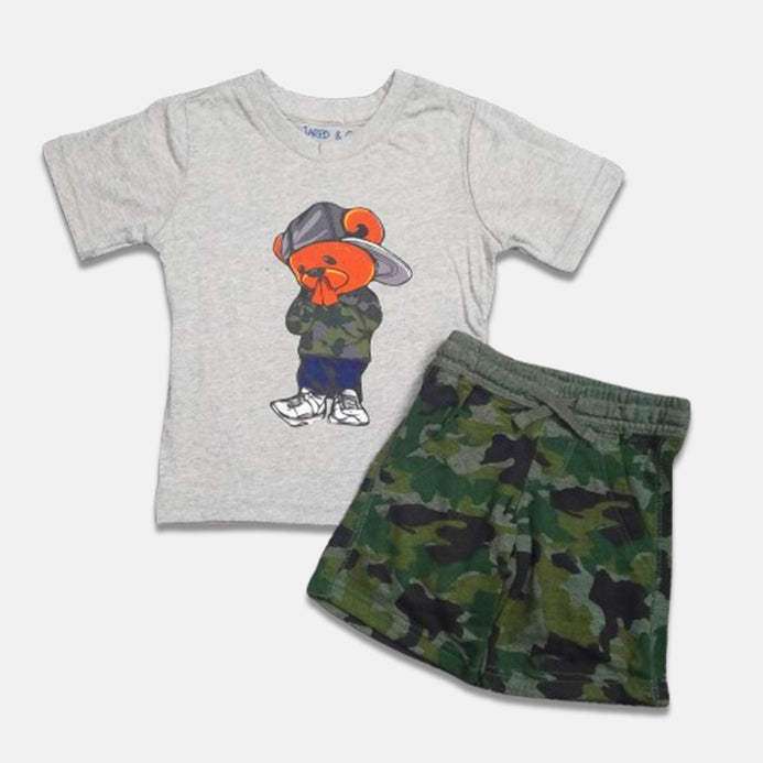 JC Bear Print Grey T-Shirt With Camuflage Shorts 2 Piece Set 14089