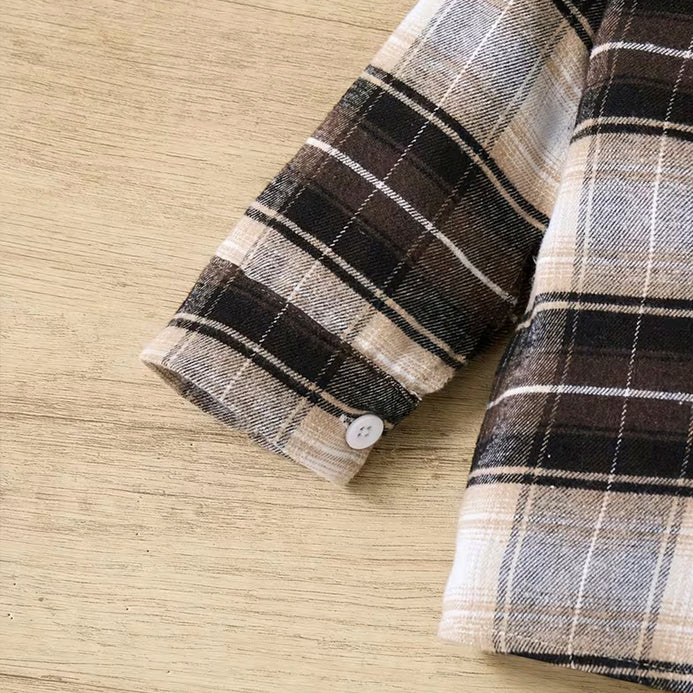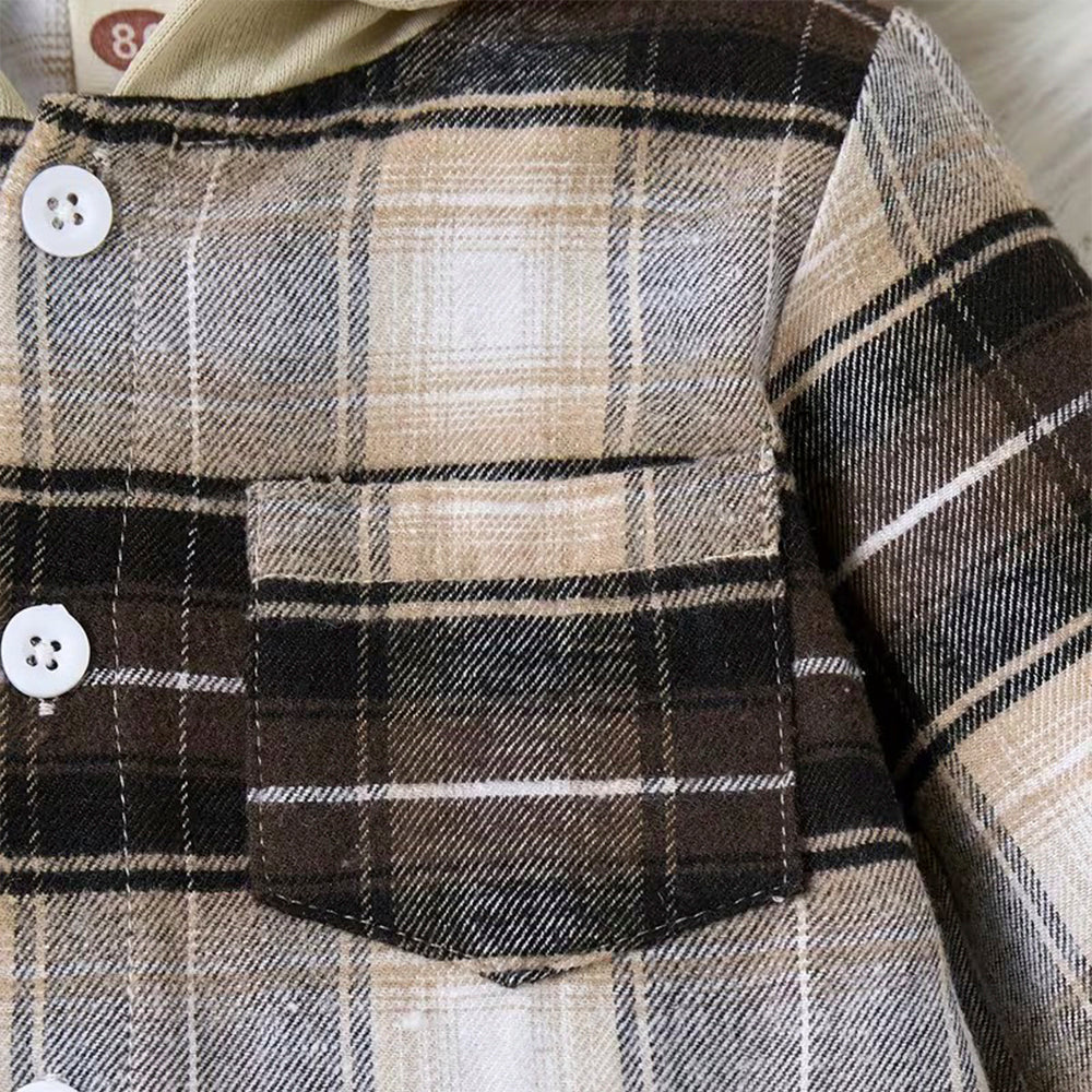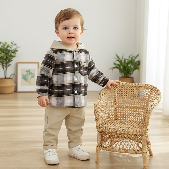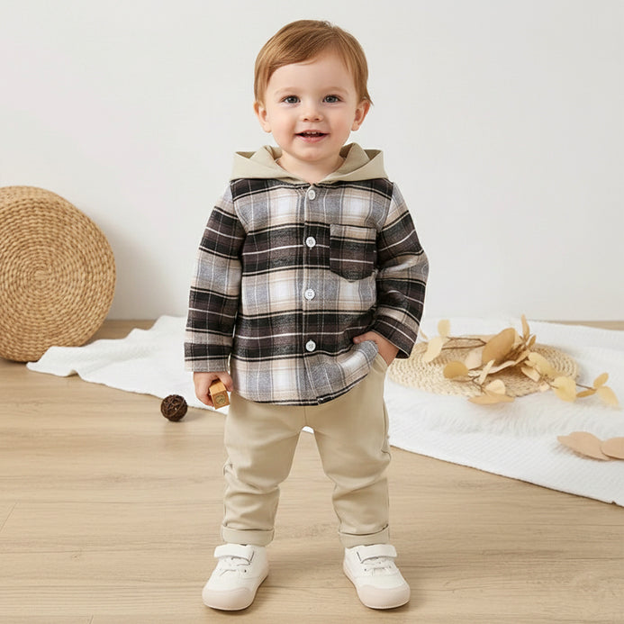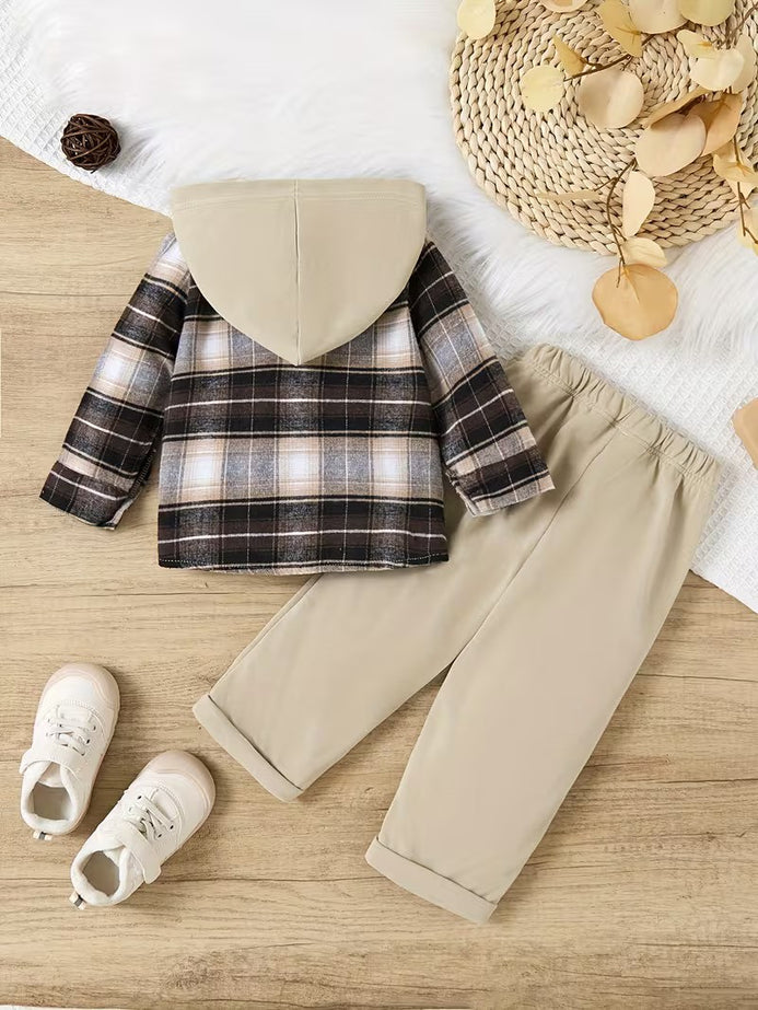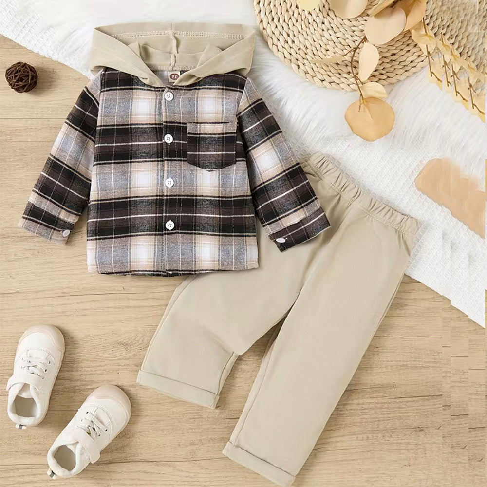 SHN Brown Check Hooded Shirt with Beige Corduroy Pant 2 Piece Set 14771