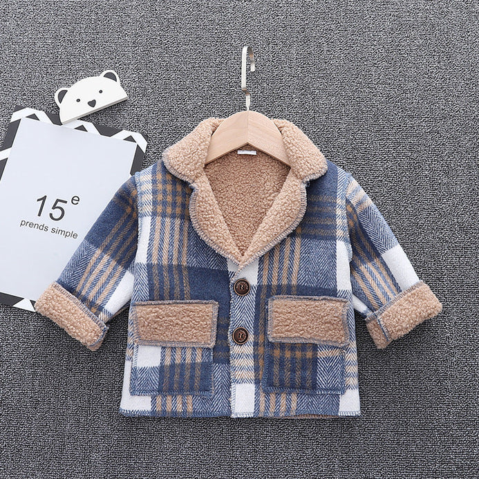 - F.Happiness Square Pocket Texture Blue & Beige Warm Woolen Coat 10535