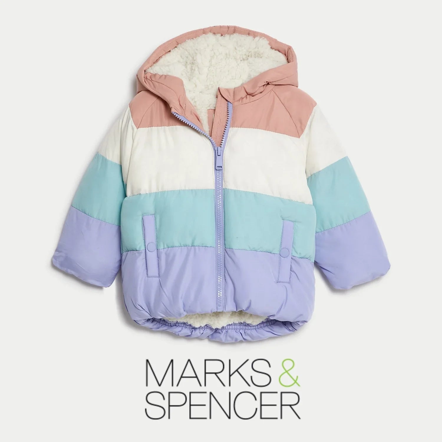 Drizzly days are no match for this vibrant, colour-block jacket. Padded style with a protective hood and a cosy borg lining. Easy popper and zip closure, plus two fastened front pockets. Our water-repellent Stormwear™ finish ensures protection against light rain showers.