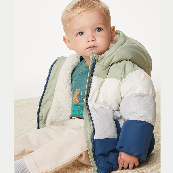 M Color Block Green With Blue Fur Warm Puffer Jacket 11877