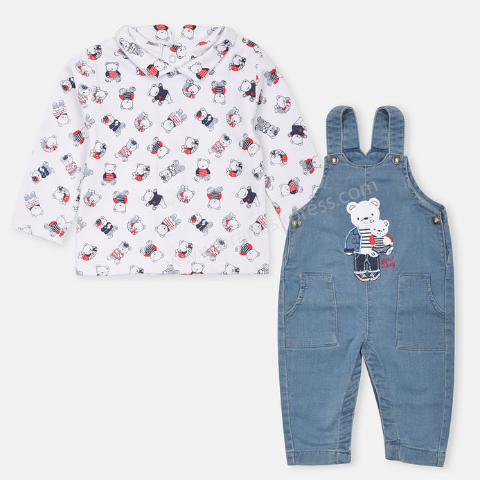 PN True Love Embroided Denim Dungaree With Shirt Bear Print 2 Piece Set 11781