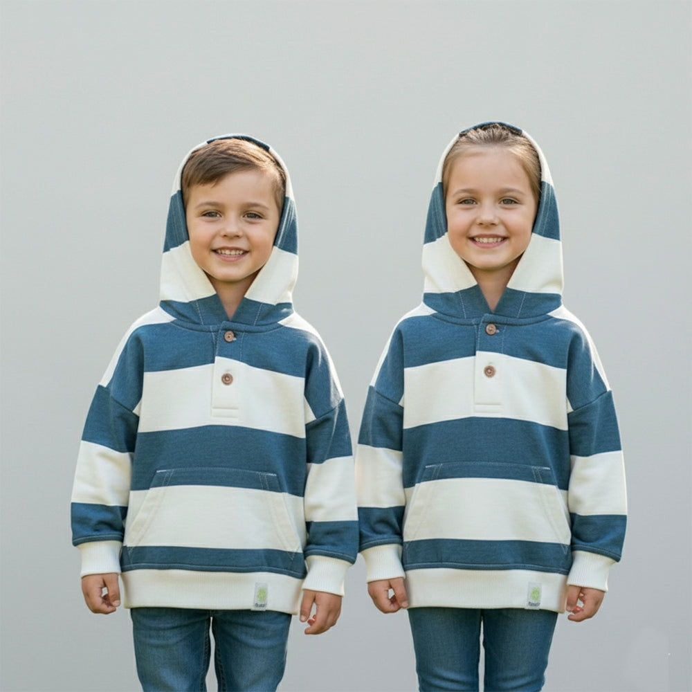 UNT Kangroo Pocket Cadet Blue & White Stripes Terry Big size without Button Hoodie 14548