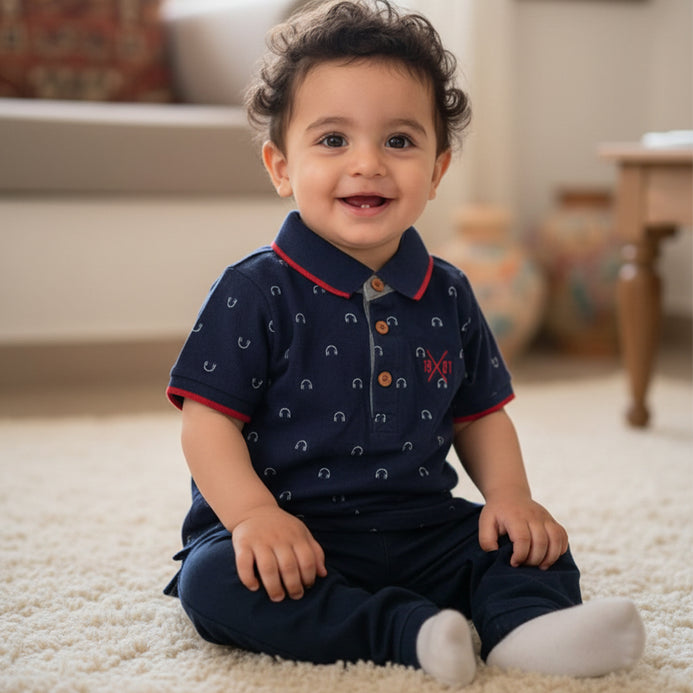 MTLN 1981 Embroided All Over HeadPhone Print Navy Blue Polo 14274