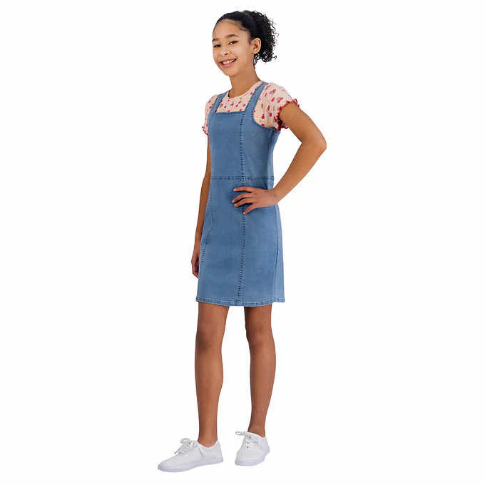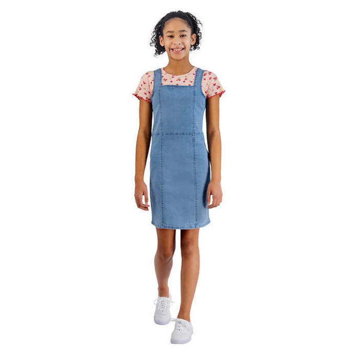 STVE Madden Strawberry Print Pink Top with Mid Blue Denim Dungaree 2 Piece set 13665