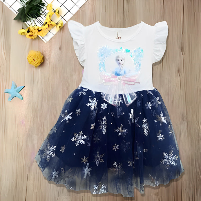 BXD Sequin Style Frozen Foil Print Bottom White With Blue Frock 11631