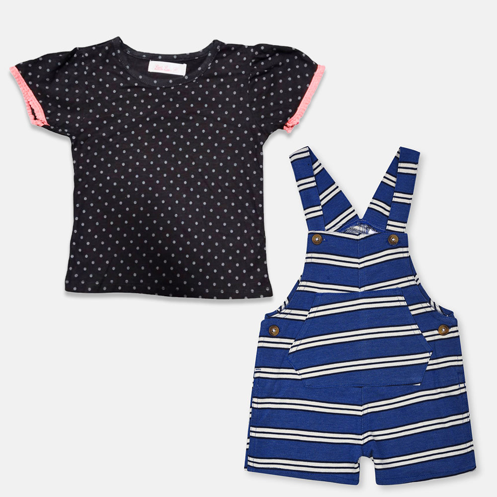 LL Black Polka Dots Top with Striped Cadet Blue Dungaree 2 Piece Set 12886
