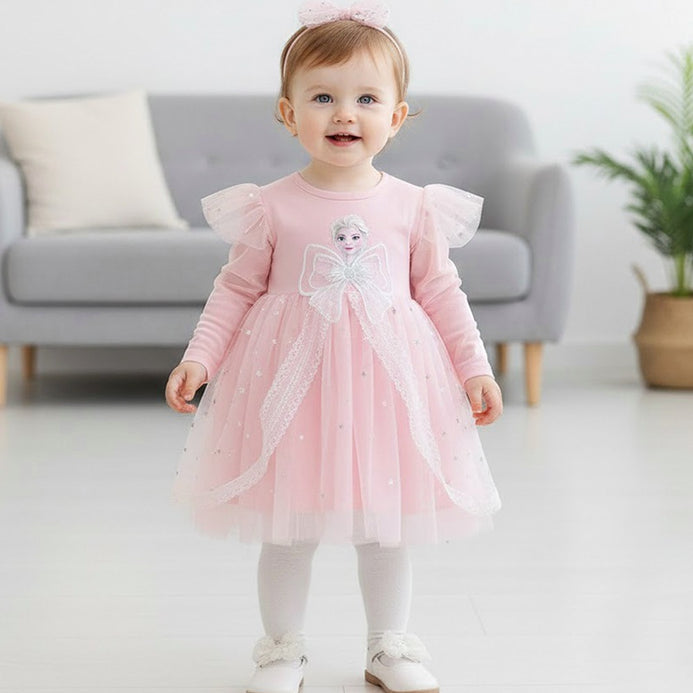 - YJTX Big Elsa Print Bow & Lace Style Pink Frock 13100