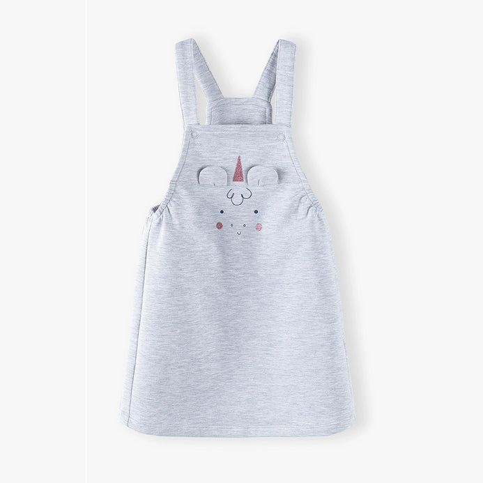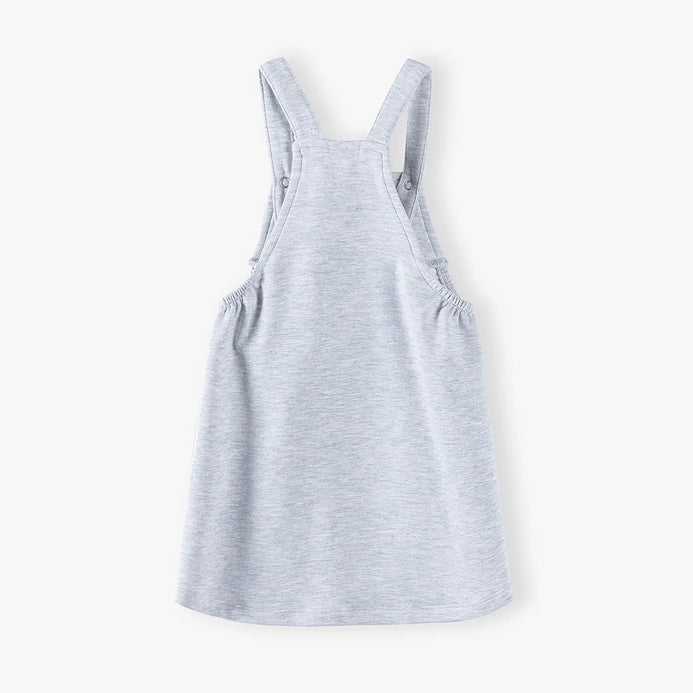 - A simple dungaree dress in a light gray color from the Mini Imagine line is made of a pleasant French terry fabric consisting of 80% cotton, 15% polyester and 5% elastane. The fabric is slightly gathered under the armpits and finished straight at the bottom
