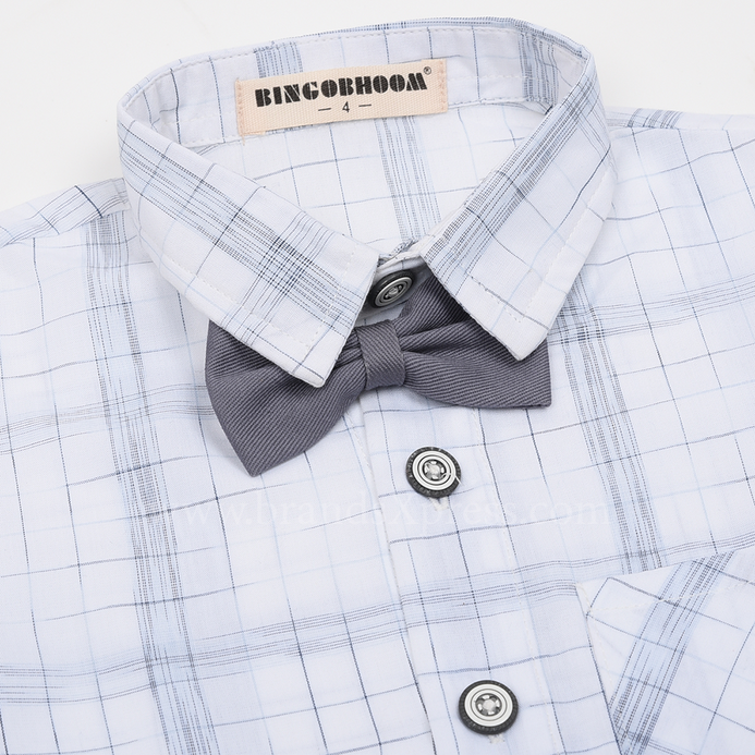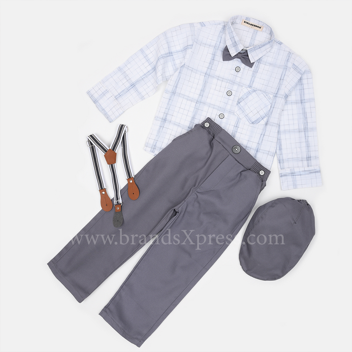 B.B Sketch Lines White Shirt & Grey Pant 5 Piece Set With Bow , Gallace & Cap 10460