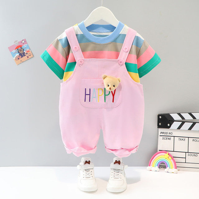 CN Bear Badge Multi Stripes T-Shirt With Purple Dungaree 2 Piece Set 10819