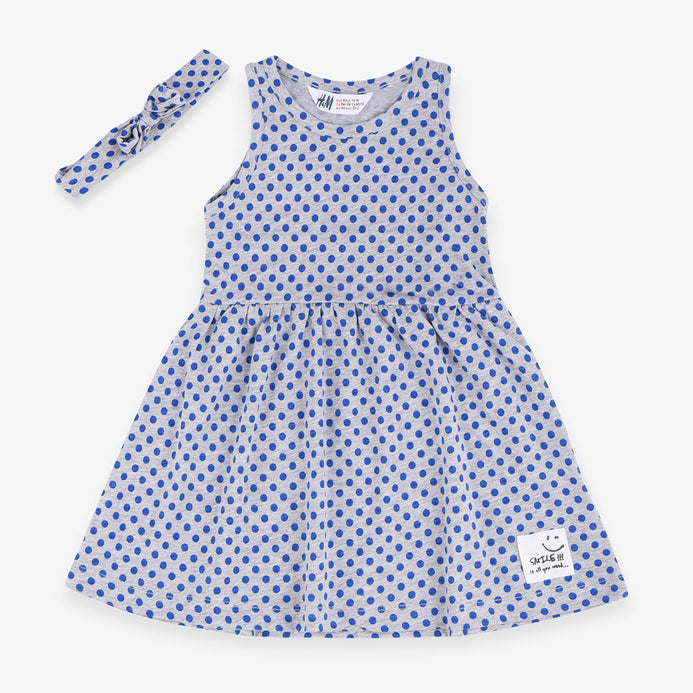 H&M Blue Polka Dots Grey Frock with Hair Band 1911
