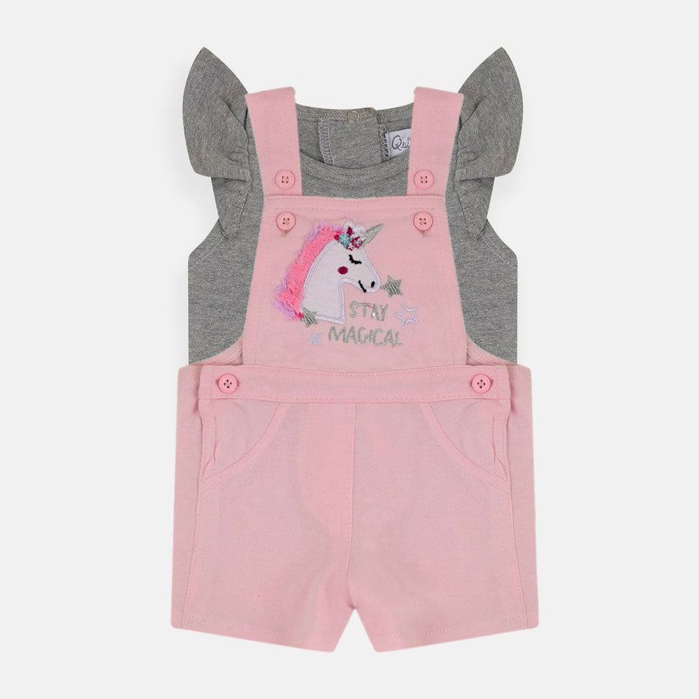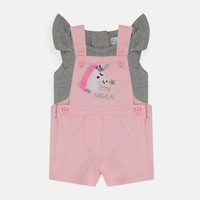QLT Stay Magical Embraided Unicorn Pink Dungaree With Grey Top 2 Piece Set 4175
