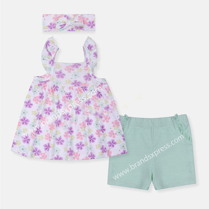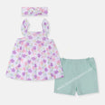 QLT Soft Flowers White Frock With Contrast Shorts & Head Band 3 Piece Set 8791