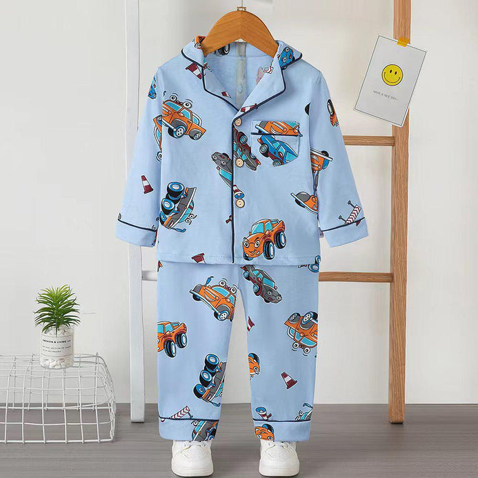 XHD All Over Cars Print Blue Front Buttons 2 Piece Trouser Set 10716