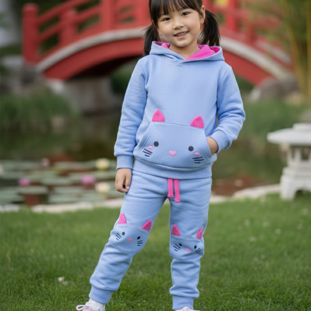 5.10.15 Cat Face Kangroo Pocket Style Terry Hoodie With Trouser Sky Blue Tracksuit 14715