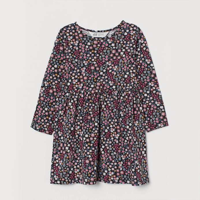 HM All Over Little Pink Flowers Black Full Sleeves Frock 12252