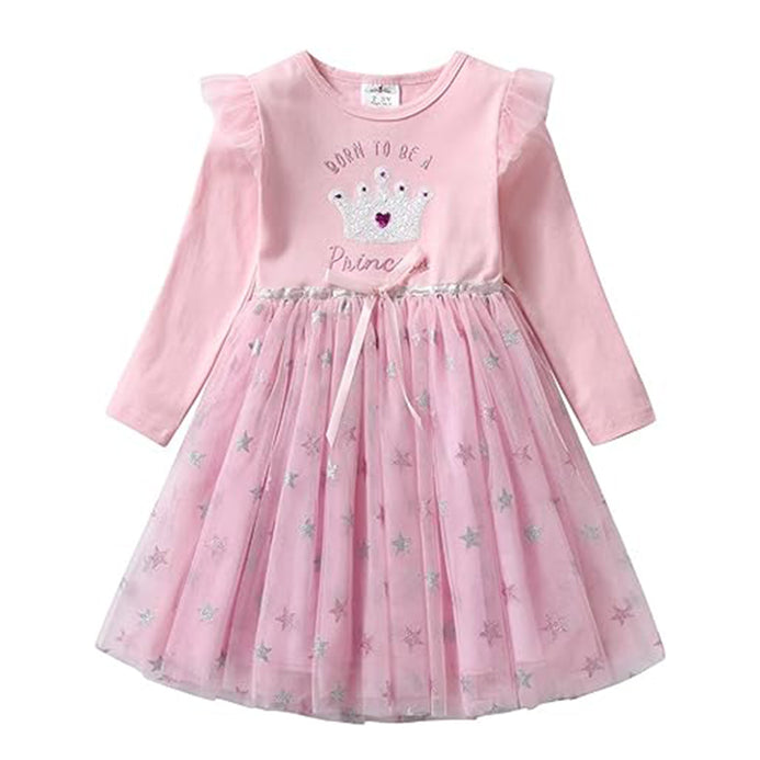 VKT Sequin Crown Glitter Stars Bottom Pink Full Sleeves Frock 11832