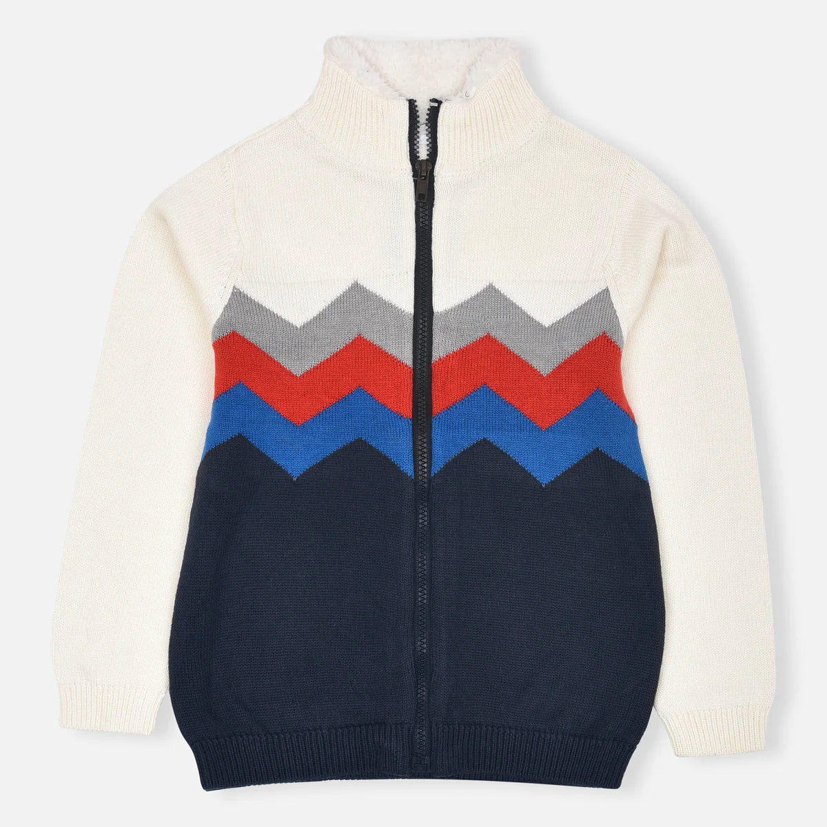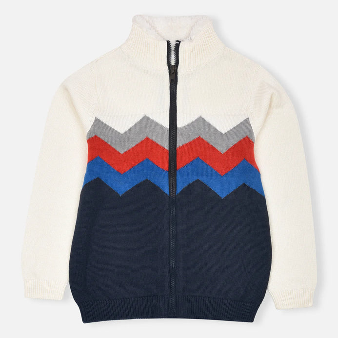 ZR Fur Mock Neck Zig Zag Design White Zipper Sweater 12007
