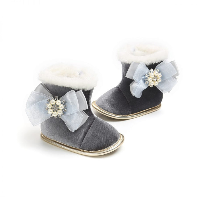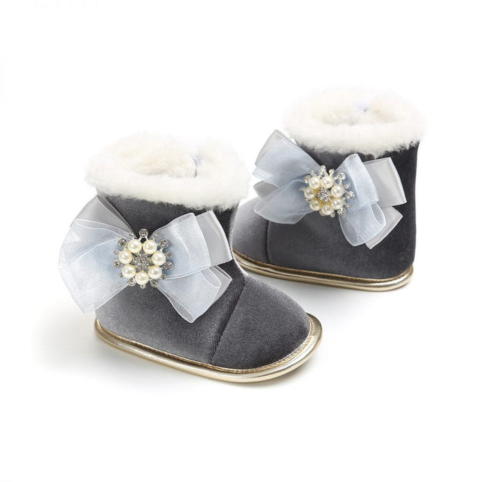 - MPW Side Pearls Bow Velvet Grey Fur Soft Bottom Shoes 10364