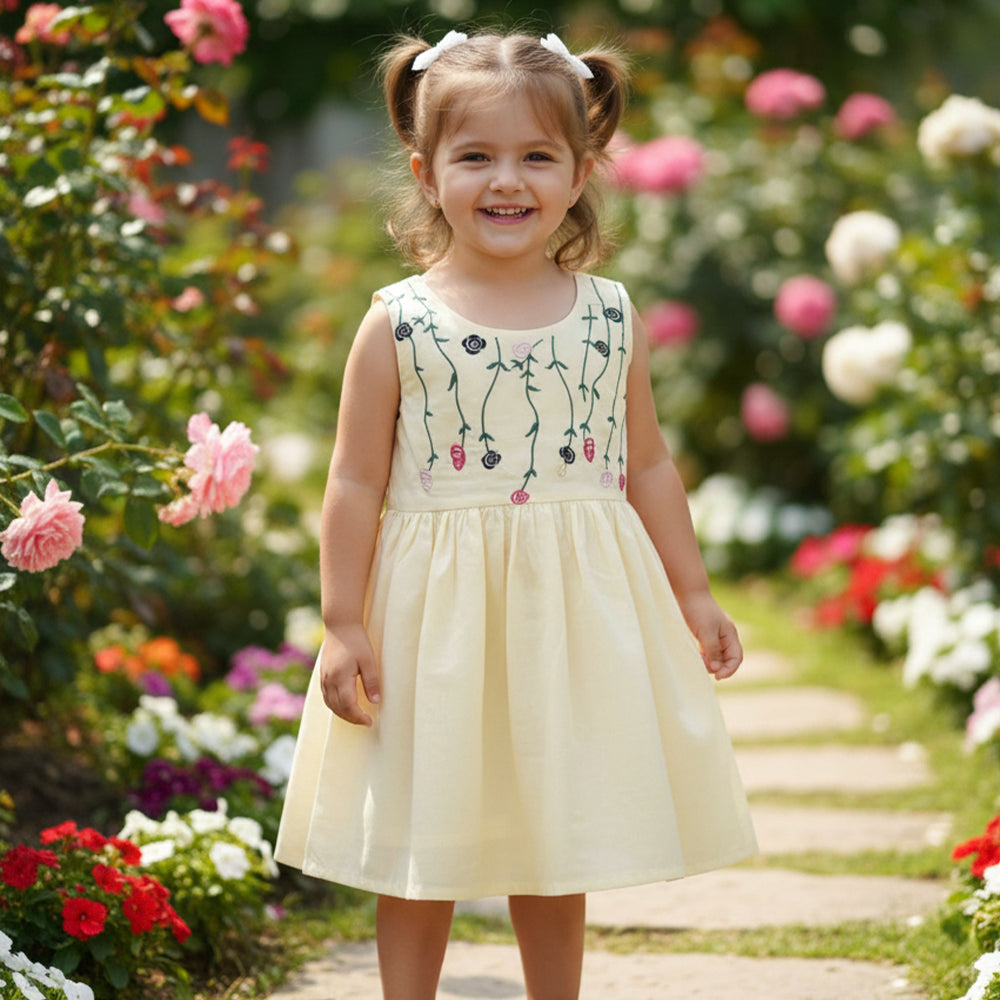 BRLA Multi Embroided Flowers Soft Yellow Sleeveless Cotton Frock 14462
