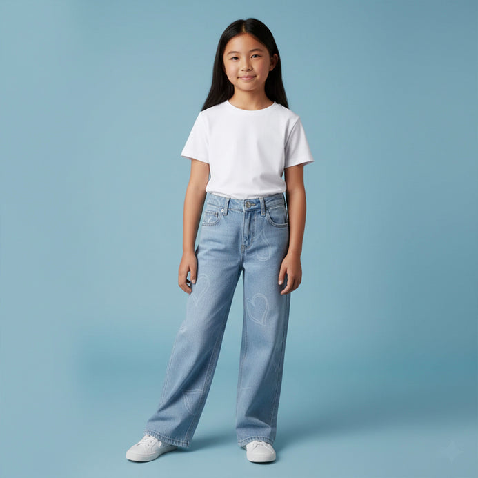 PO All Over Hearts Style Wide Leg Mid Blue Denim 14968