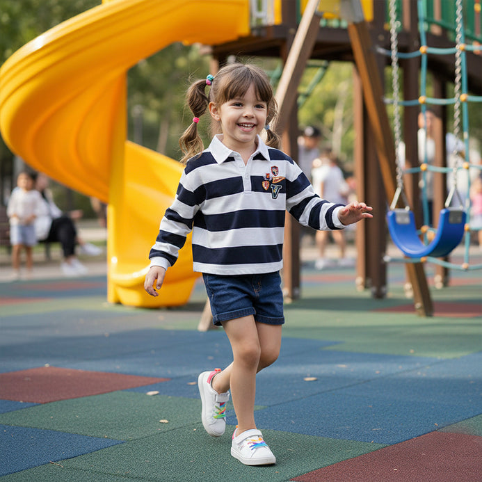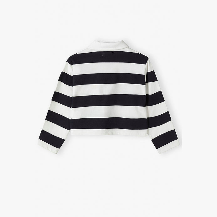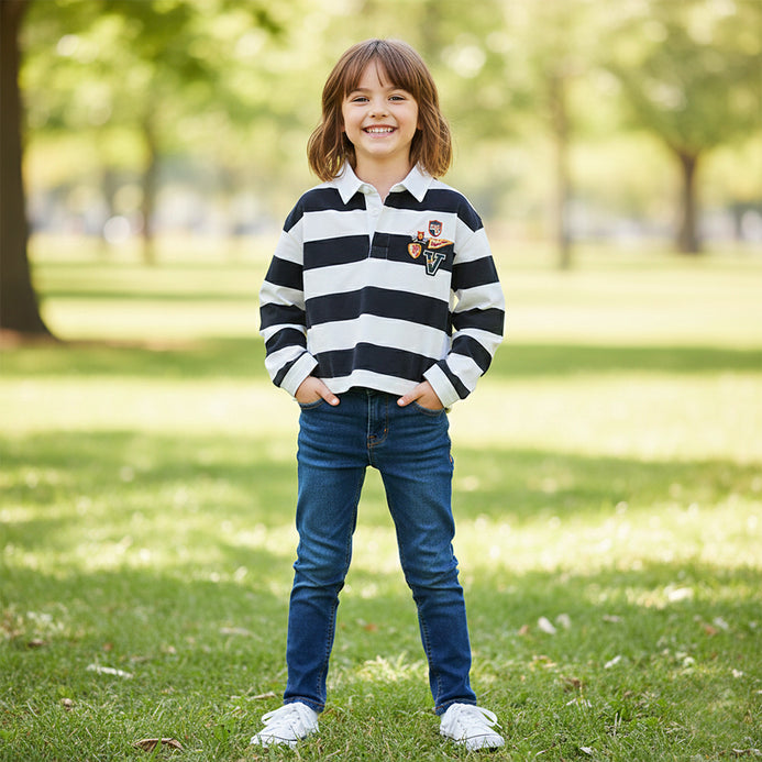 L&S Badges Embroided Navy Blue And White Strips Short Body Full Sleeves Polo T-shirt 14979 A