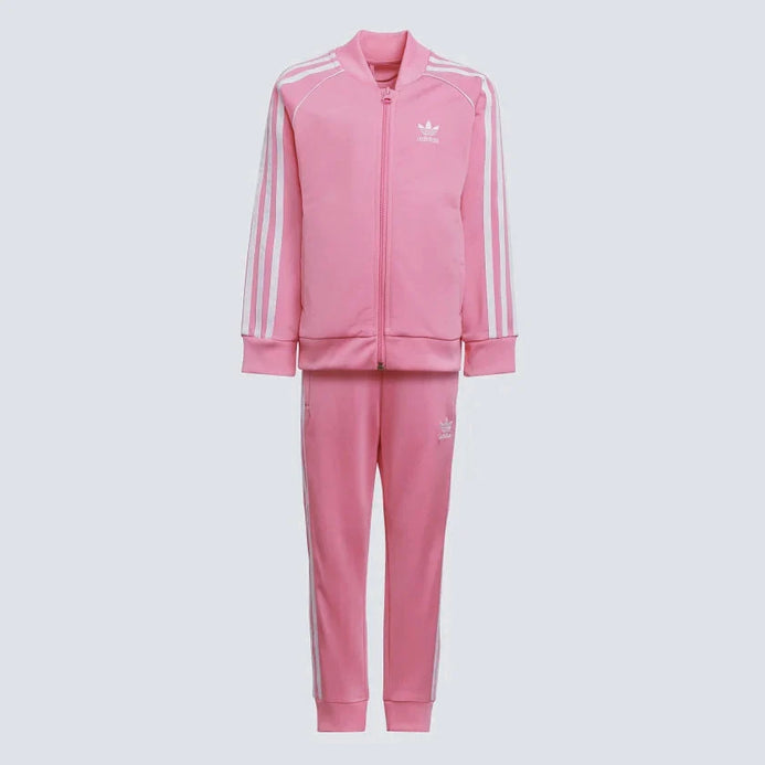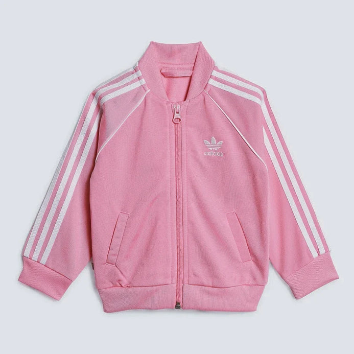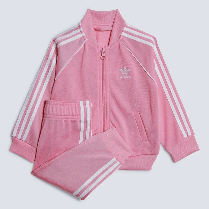 Get them reppin' a timeless adi look with this infants' SS Tracksuit . In a Pink colourway, this downsized suit is built from smooth terry fabric for a sporty, retro look. It comes with a Dark full zip track top and matching pants for the ultimate 3-Stripes 'fit. With long raglan sleeves and an elasticated waistband with a Cord for a custom fit, this tracksuit is finished with contrasting 3-Stripes running down the sleeves and legs for a true adi finish.