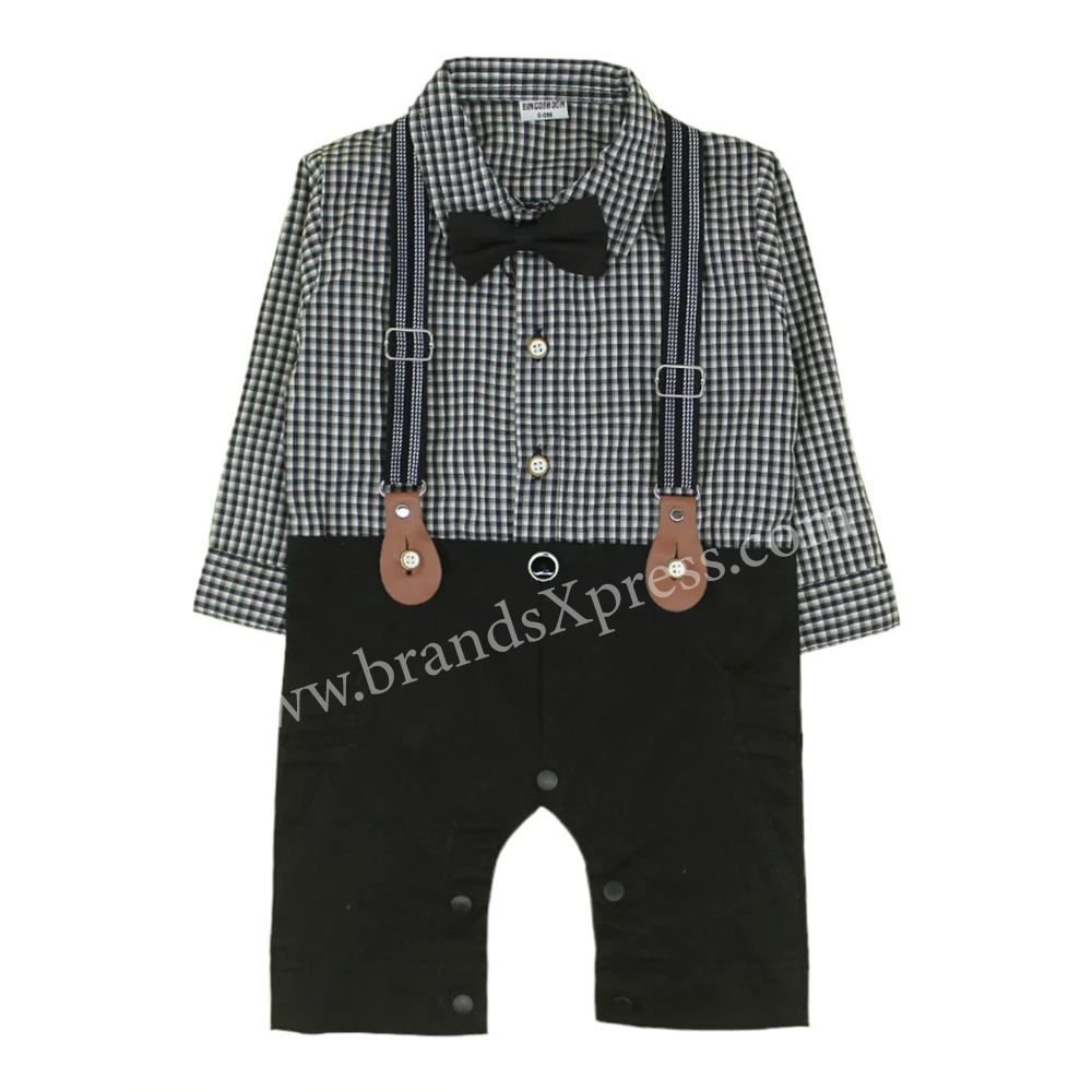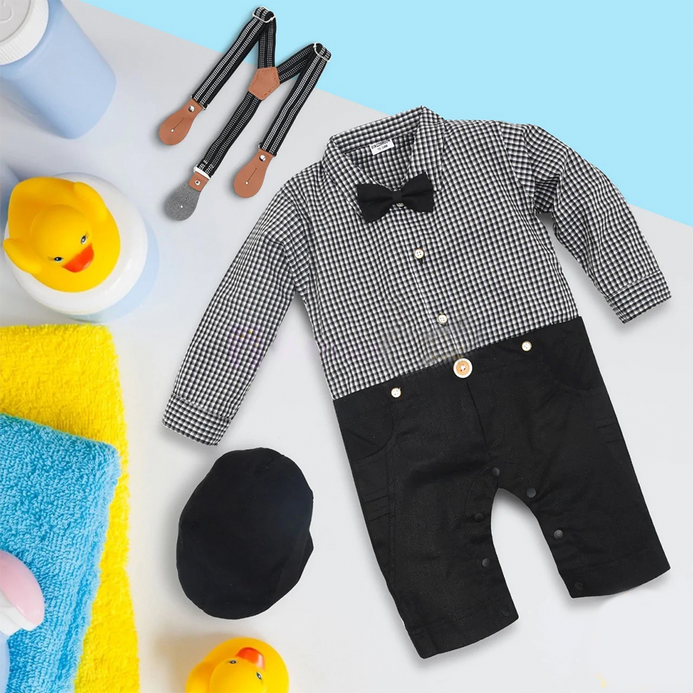 - B.B Check Black Top 4 Piece Black Romper Set With Bow Galancee & Cap 10296