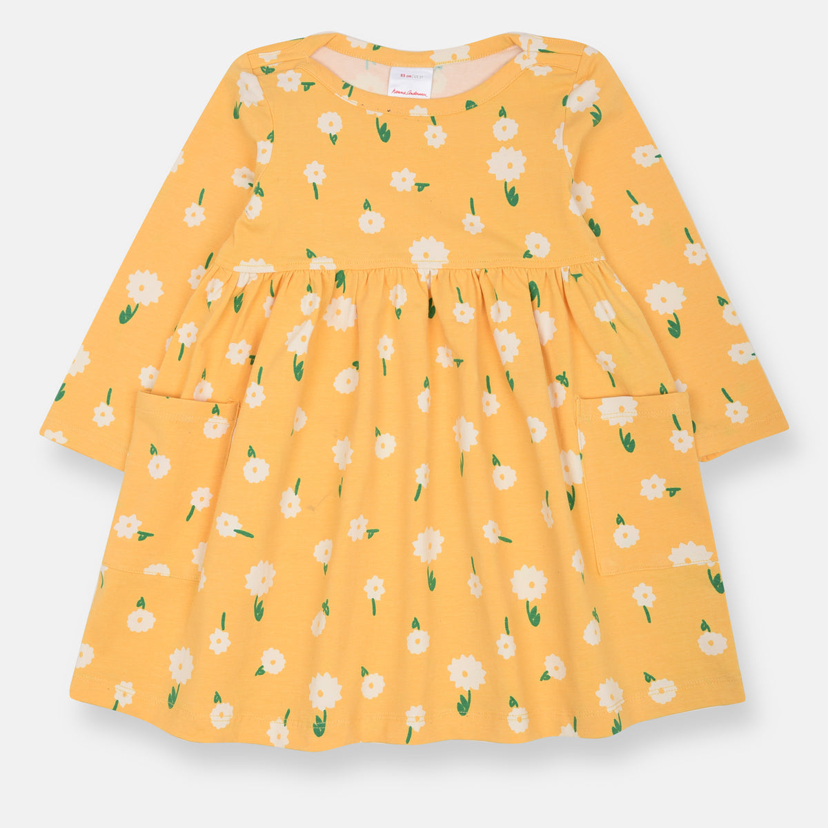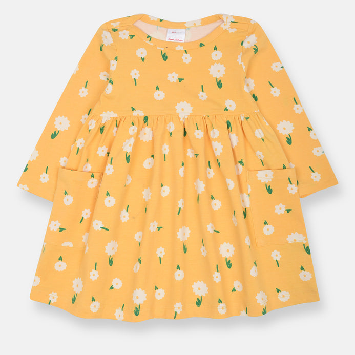 - H&E White Flower Print Pocket Style Full Sleeves Yellow Frock 9788