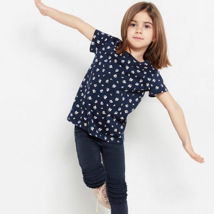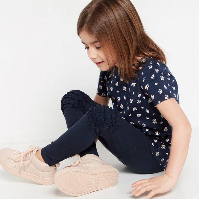 Soft and comfy leggings with fine frills on both knees. Made from an organic cotton blend.