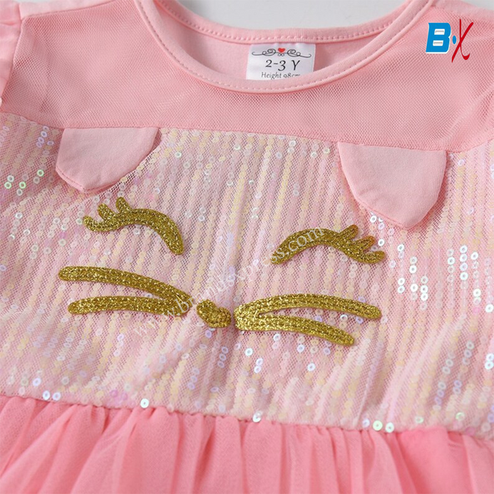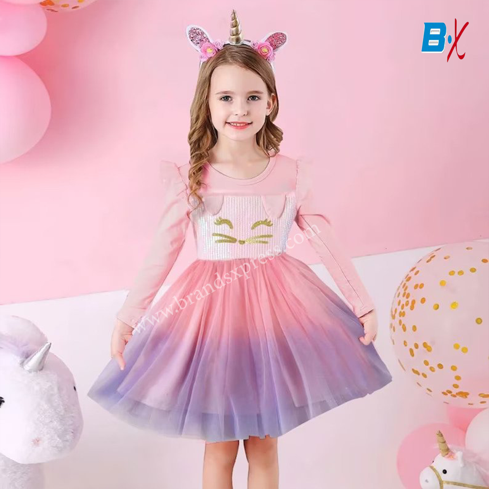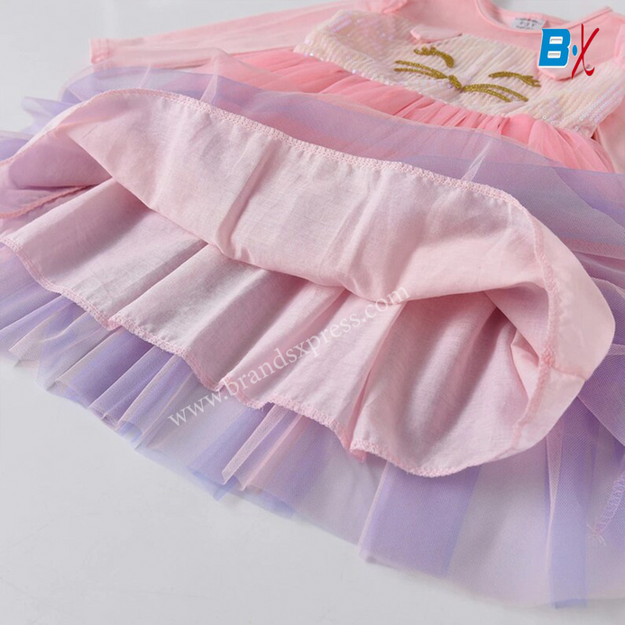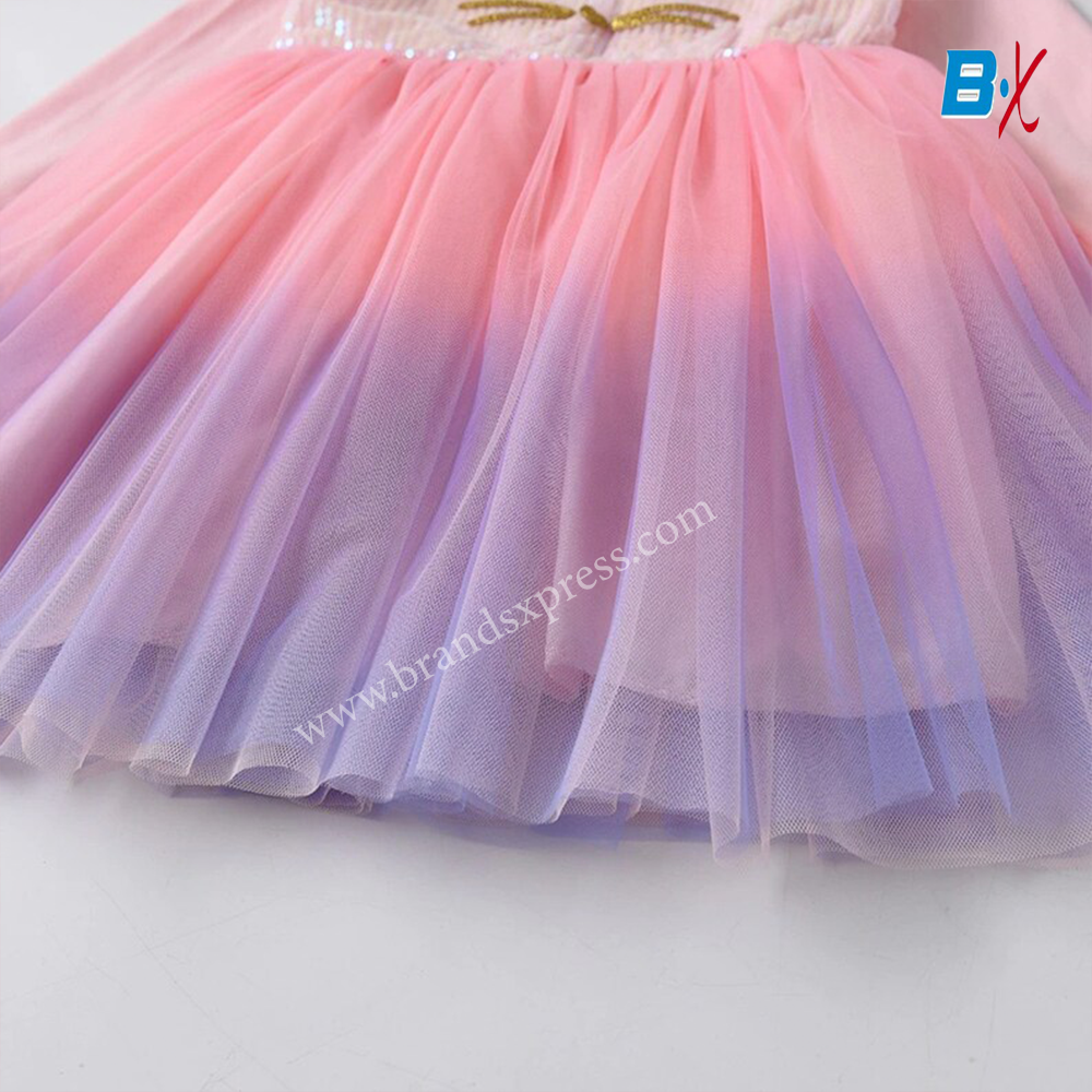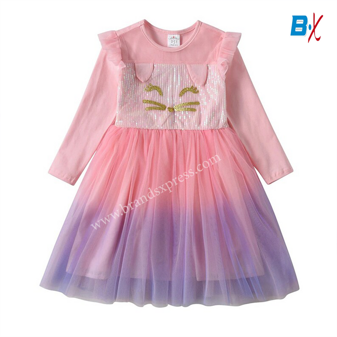 VKT Cat Shimmering Face Sequin Top Multy Bottom Full Sleeves Pink Frock 10147