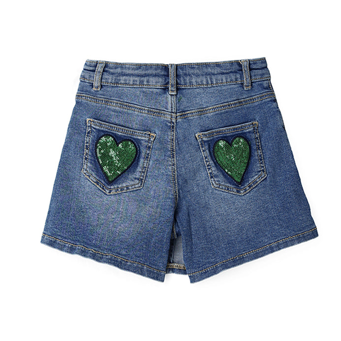 OM Front Style Sequin Hearts Denim Blue Girls Short 10789