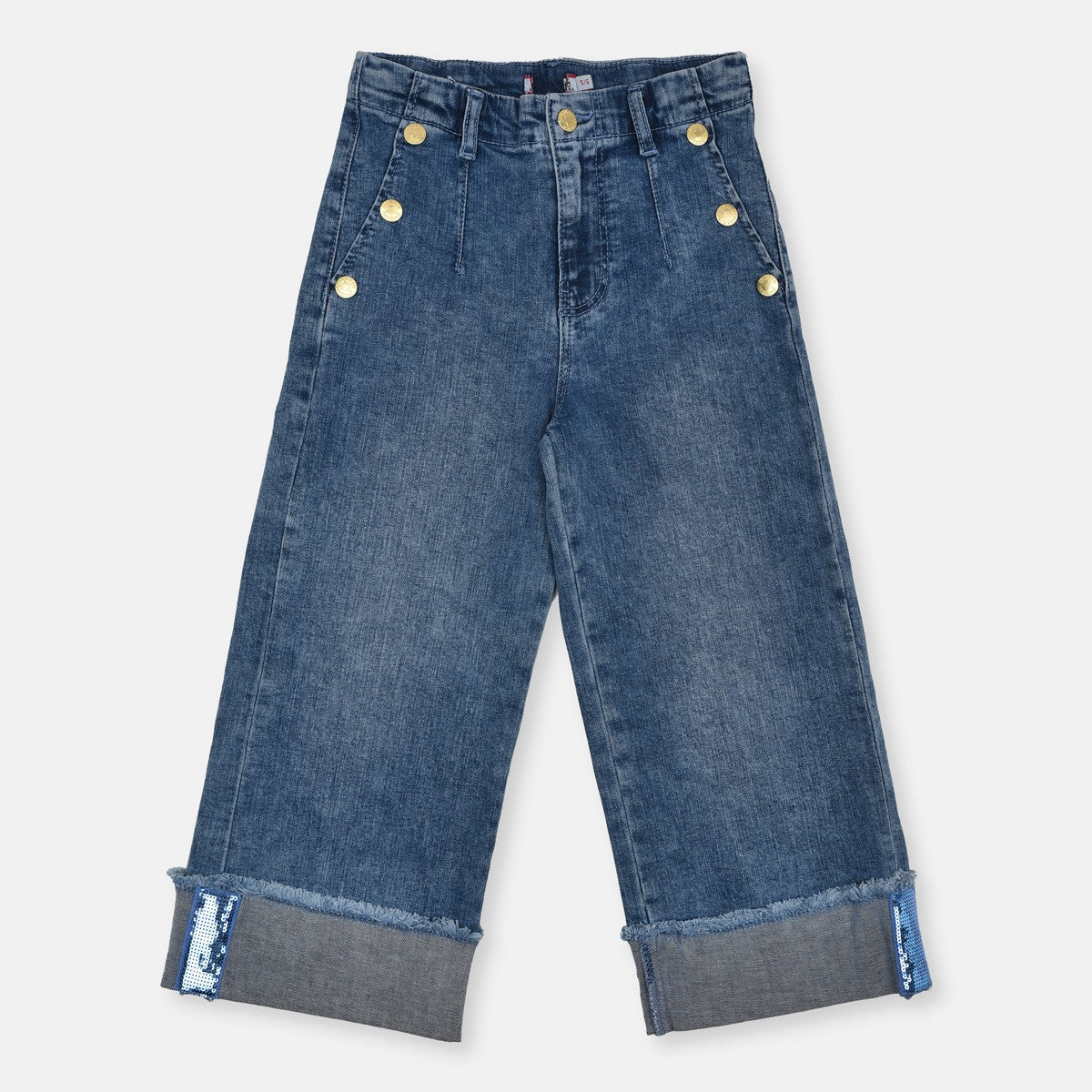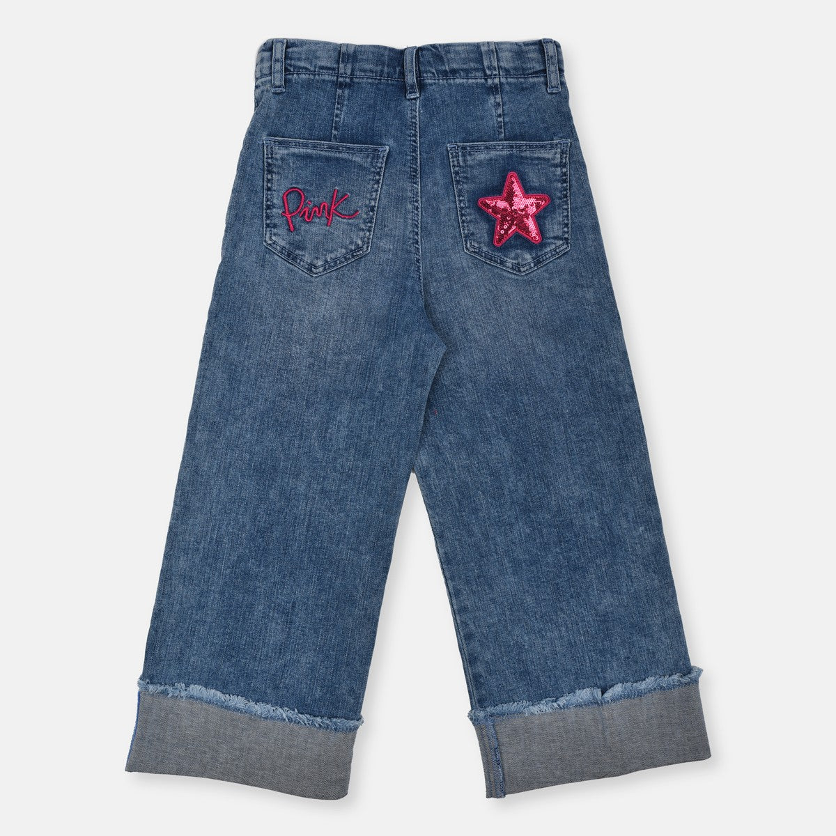 OM Pink Stars Golden Button Floded Bottom Wide Leg Blue Denim 12958