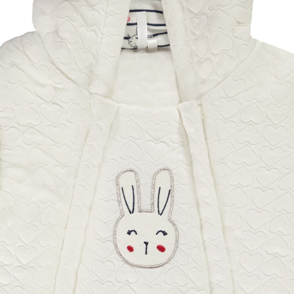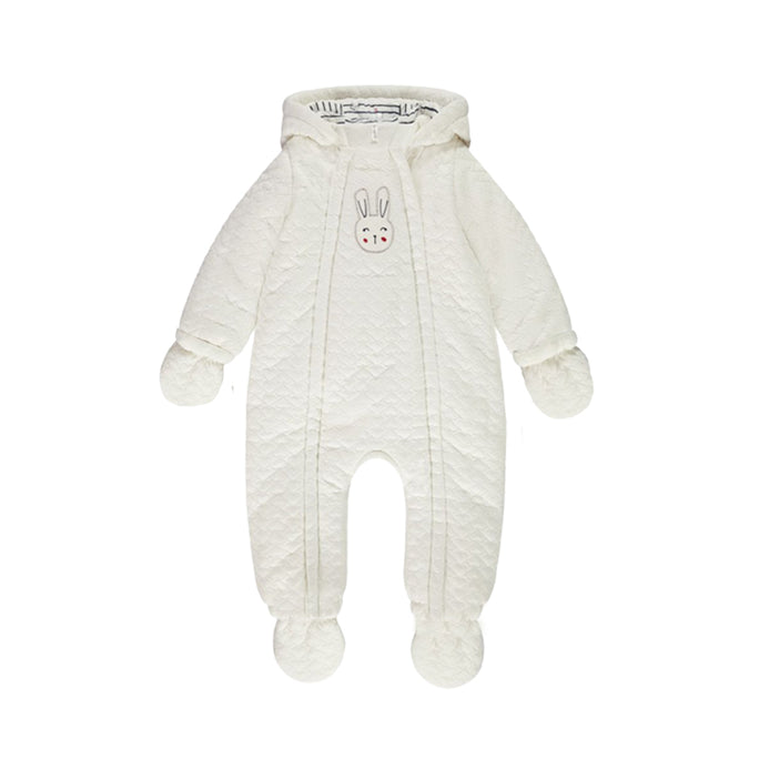 Theme: "Bunny Love" Combi-pilote in jacquard quilted hearts effect. Plain ecru color. Hood with sailor-style striped lining. Invisible double-zip front opening protected from the inside. Rabbit appliqué patch on front. Tone-on-tone sherpa lining.