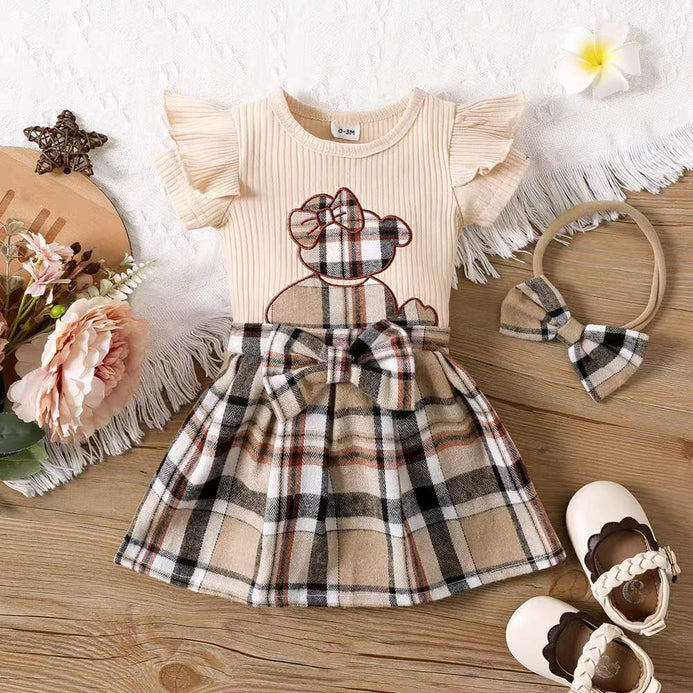 Pat Pat Burbury Style Baby Bear Aplic Skin Body Suit With Skirts & Head Band 3 Piece Set 12922