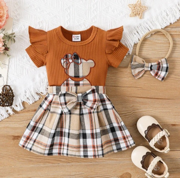 Pat Pat Burbury Style Baby Bear Aplic Rust Body Suit With Skirts & Head Band 3 Piece Set 12928