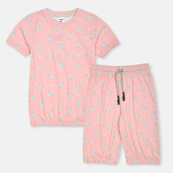 PP Co All Over Mini Cats & Flowers Print Peach 2 Piece Short Set 13298