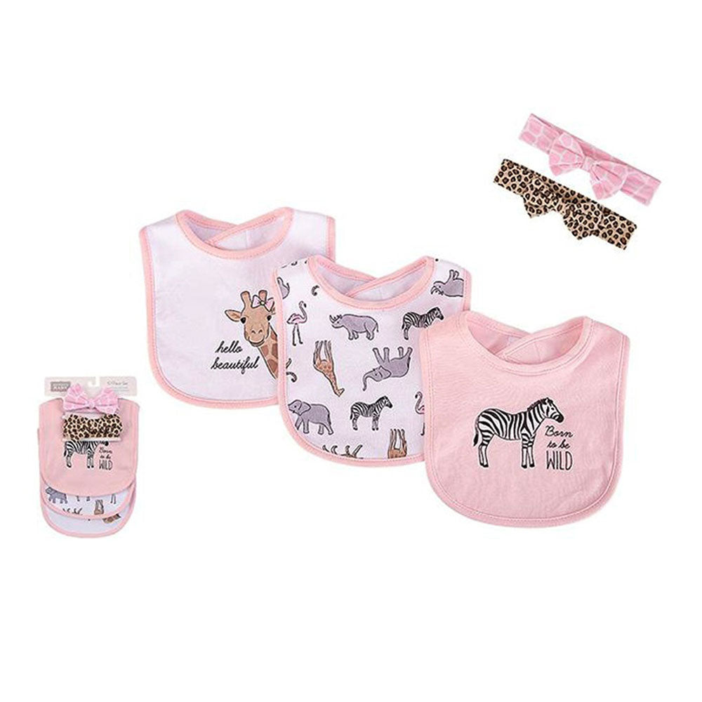 - HDSN Baby Animal Print Pink Bibs & Heads 5 Piece Set 7918