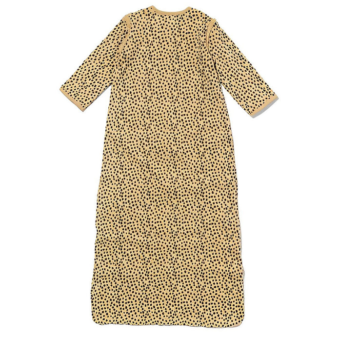 This mottled gray baby sleeping bag with cheetahs has long, zip-off sleeves. The sleeping bag closes with a zipper with chin protection, which protects baby's delicate skin. The sleeping bag has a light filling and is suitable for use in warmer weather and a room temperature between 18°C and 24°C.