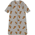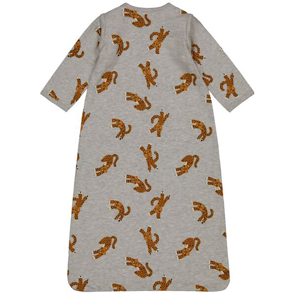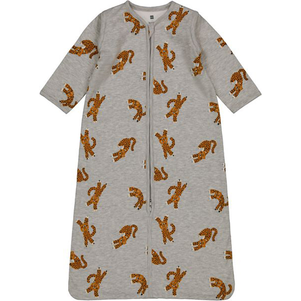 This mottled gray baby sleeping bag with cheetahs has long, zip-off sleeves. The sleeping bag closes with a zipper with chin protection, which protects baby's delicate skin. The sleeping bag has a light filling and is suitable for use in warmer weather and a room temperature between 18°C and 24°C.