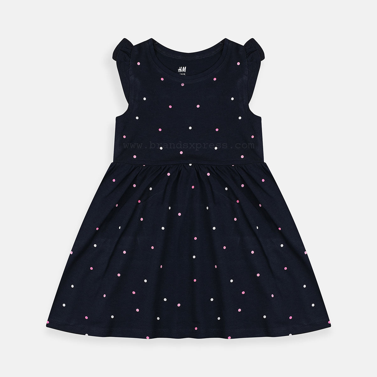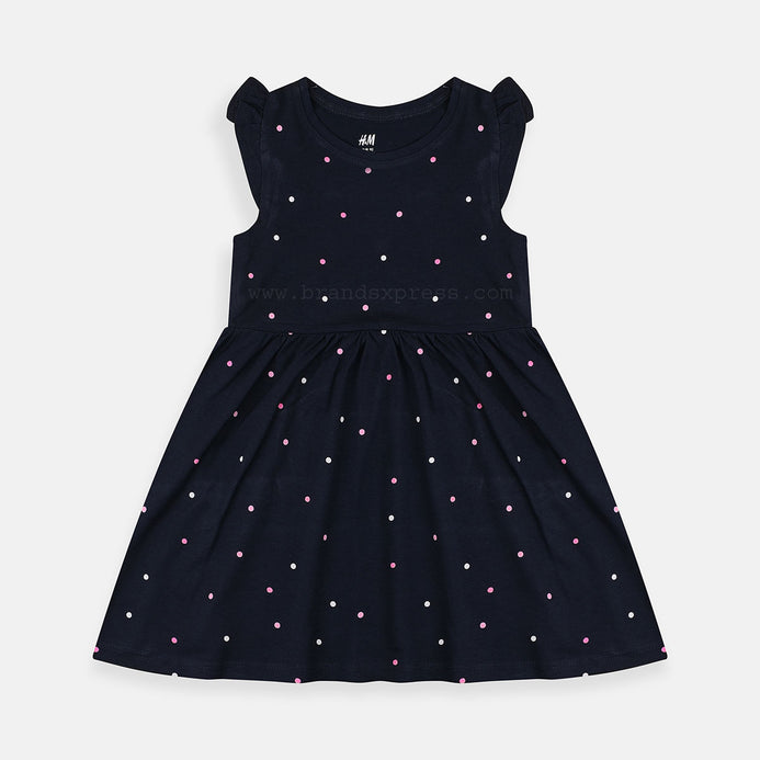 - H Dots Frill Sleeves Navy Blue Frock 6167