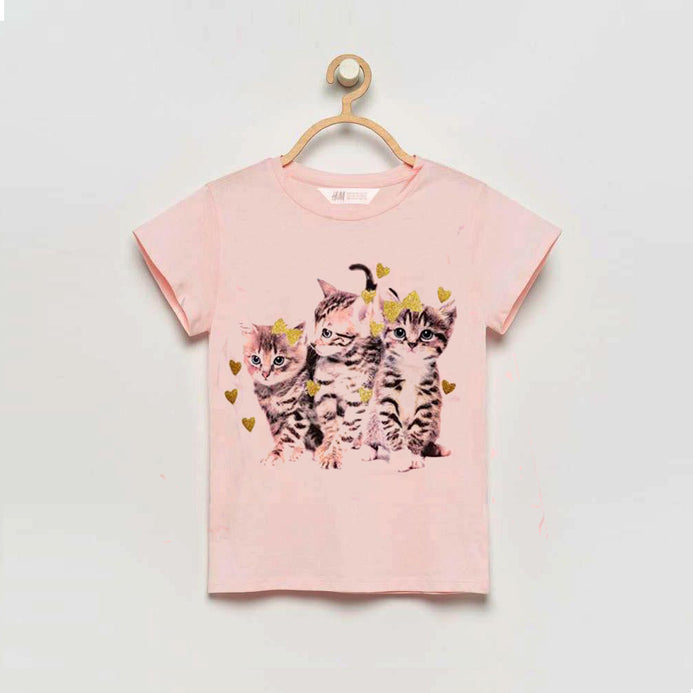 - HM Glitter Heart Cats Print Light Pink Tshirt 7065