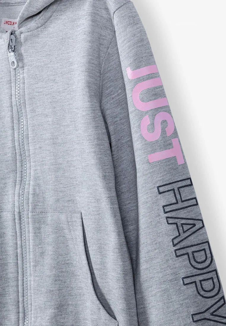 L&S Just Happy Print Sleeve Grey Terry Zipper Hoodie 13447