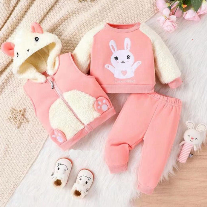 - SHEN kids Cute Rabbit Embroided Furr Sleeves Style Sweatshirt & Trouser Fleece with Zipper Hoodie 3 Piece Set 13989