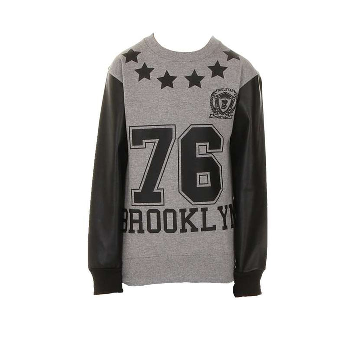 Boys Soul Star BSW Brooker Sweatshirt. Trendy crew neck Sweatshirt with large 76 Brooklyn print to front. Faux Leather effect PU sleeves. Dual material Sweatshirt with Cotton base and Polyester sleeves. Star design along neck area.