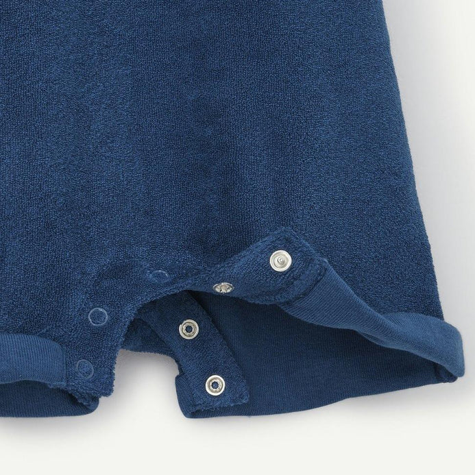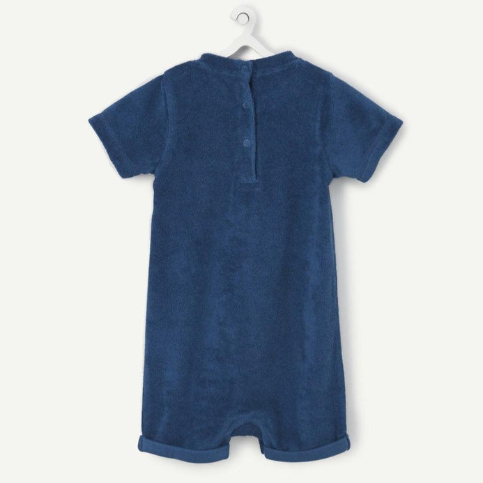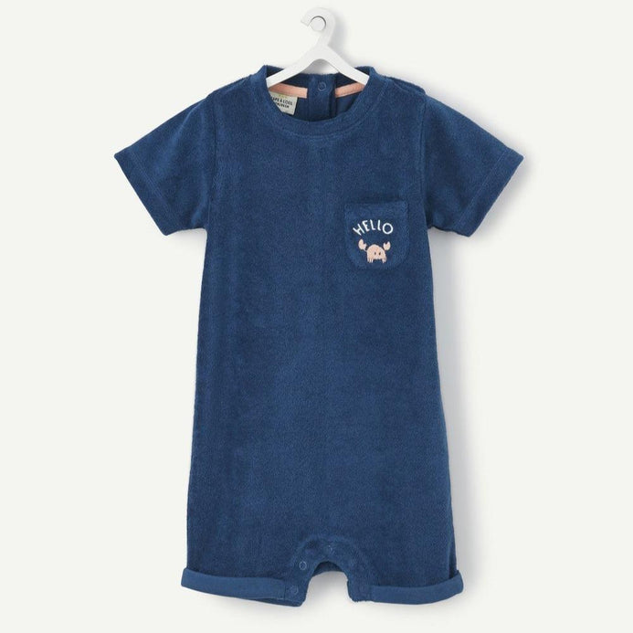 *Please check size chart before Placing order ( Inches ) Playsuit in terry towelling. Round neck and short sleeves. Patch pocket on the chest with embroidery. Poppers at the back between the legs to make dressing and changing easier. Stitched turn-up at the hem.