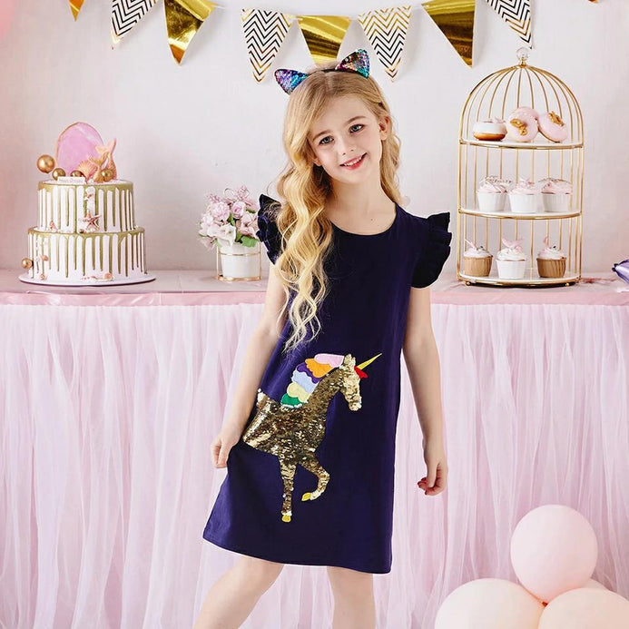 VKT Frill Sleeves Unicorn Sequin Navy Frock 6021