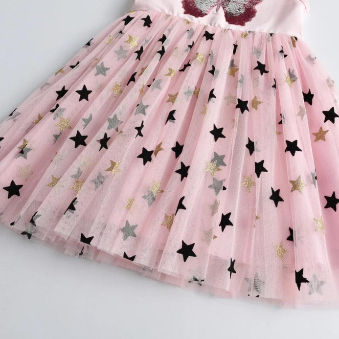 - VKT Reversible Butterfly Sequin Star Net Bottom Pink Frock 7493